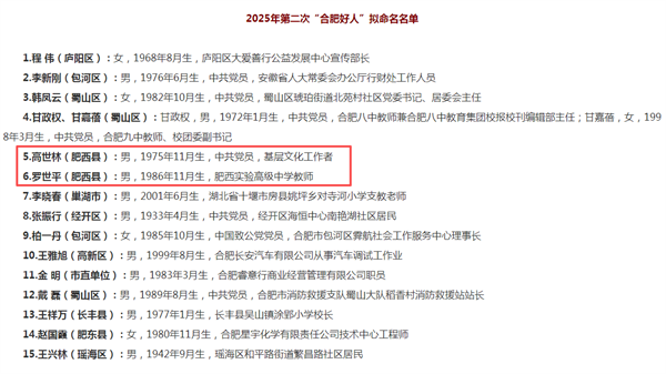 近日,我縣柿樹崗鄉(xiāng)文化站高世林、肥西實(shí)驗(yàn)高級(jí)中學(xué)教師羅世平被市委宣傳部評(píng)為2025年第二次“合肥好人”,成為我縣敬業(yè)奉獻(xiàn)的典范。